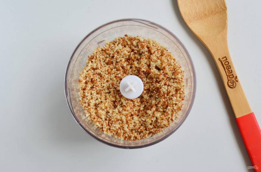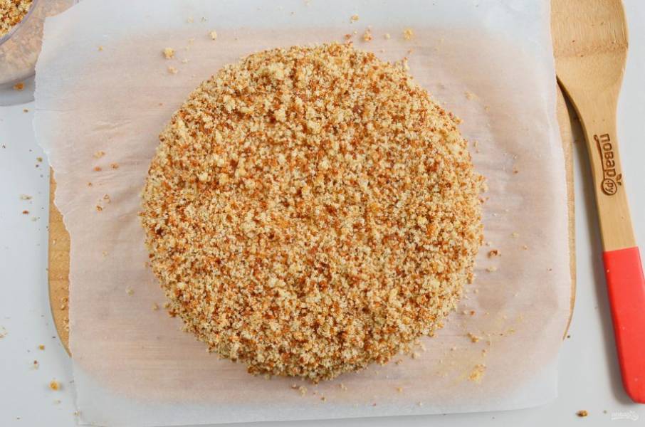 Измельчите до тех пор, пока не получатся мелкие крошки. Оставьте их для украшения торта.
