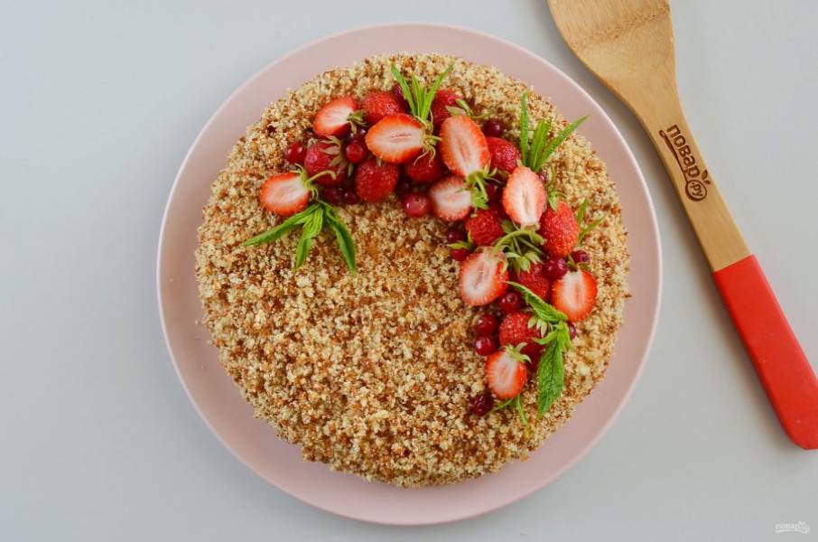 Крошками украсьте бока и верх торта. Они отлично прилипают на крем. В таком виде уберите торт в холодильник на 2-3 часа минимум, а лучше на ночь.