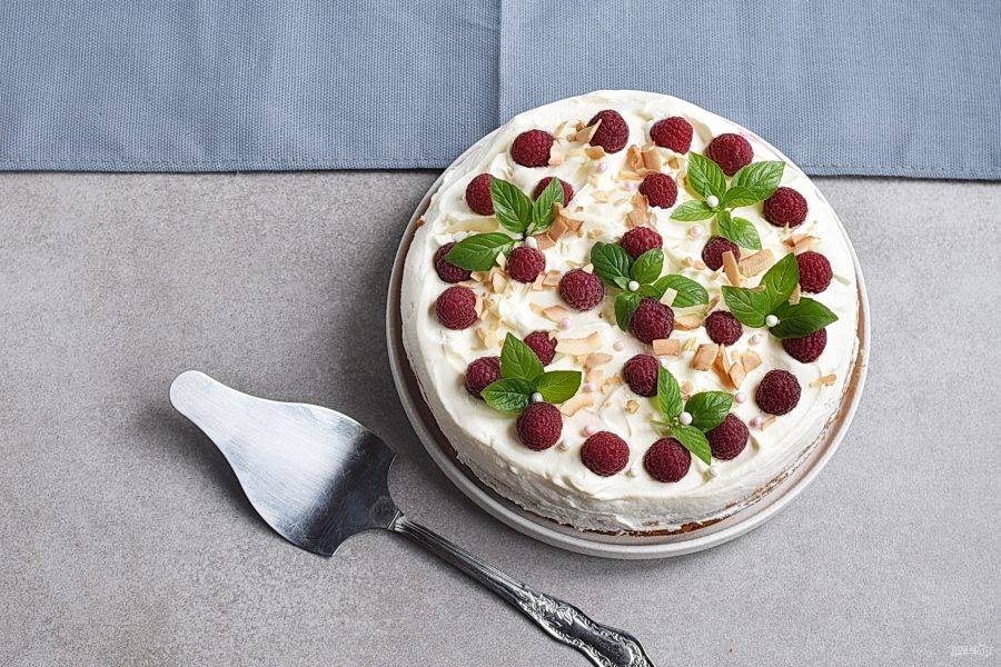 Украсьте торт оставшейся свежей малиной, мятой, миндальными лепестками или по вашему вкусу.