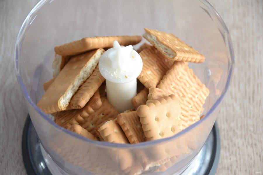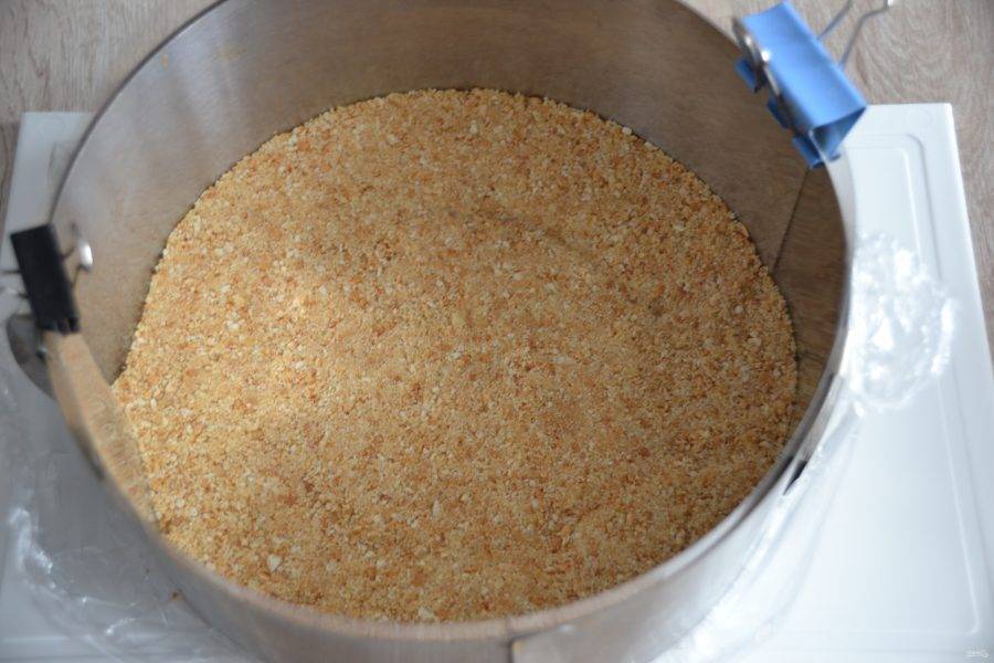 Выложите на дно подготовленной формы смесь крошки и сливочного масла, утрамбуйте, поставьте в морозильную камеру.