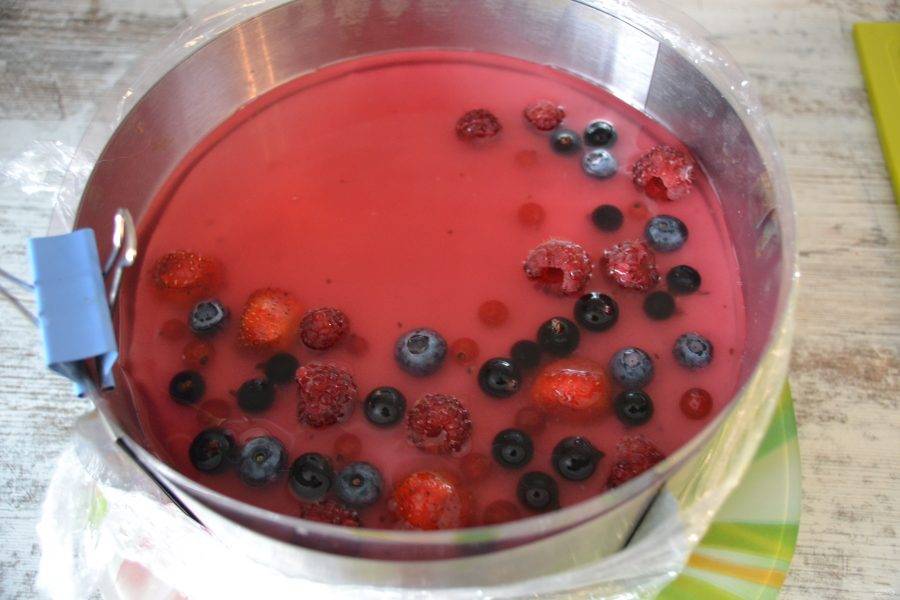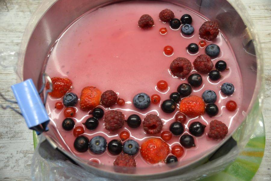 Влейте 2/3 слегка остывшего желе на торт, выложите сверху свежие ягоды, уберите в холодильник минут на 15.