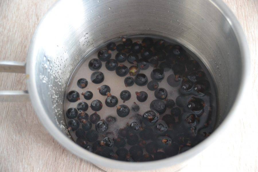 В сотейник влейте воду, выложите черную смородину, сахар, доведите до кипения, проварите несколько минут до размягчения ягод.