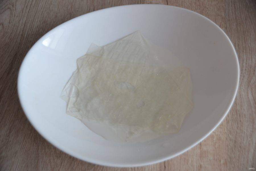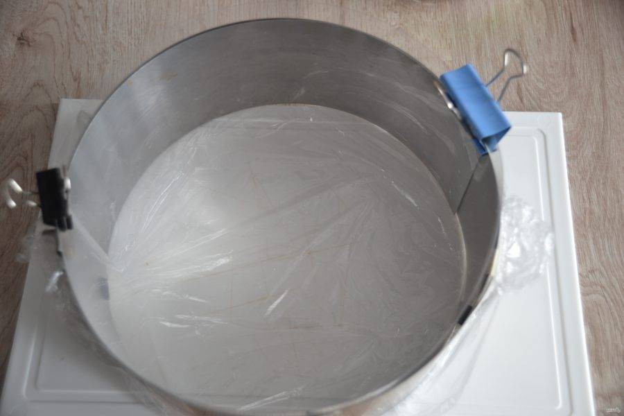 Подготовьте кондитерское кольцо диаметром 20 см. следующим образом. Установите на горизонтальную поверхность, например, на разделочную доску, оберните снаружи плотно пищевой пленкой, желательно проложить вдоль бортика ацетатную ленту.