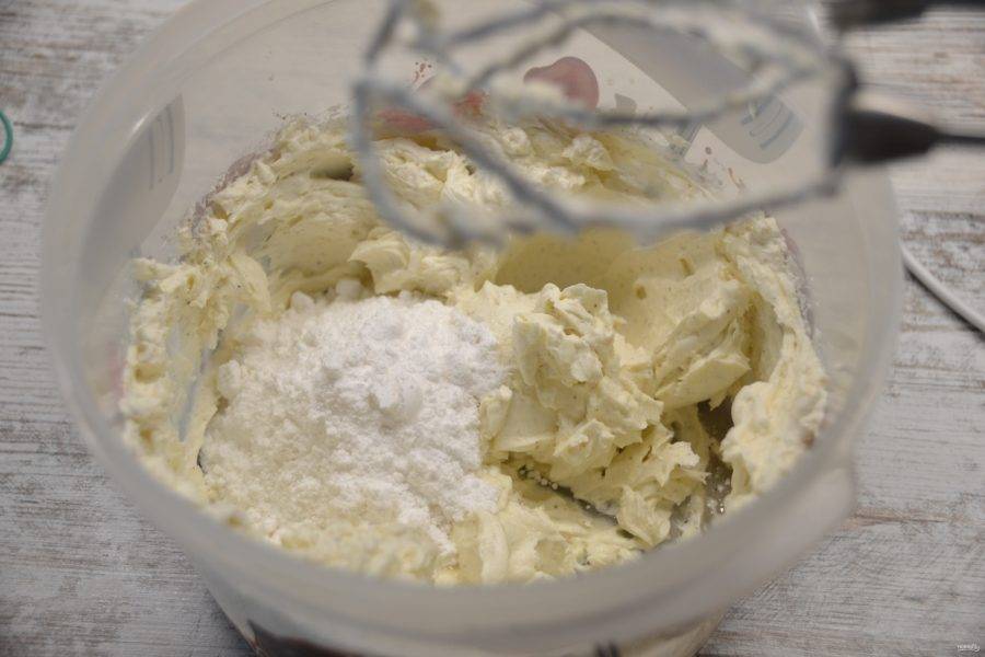 Взбейте миксером маскарпоне с ванильным сахаром и с половиной сахарной пудры.