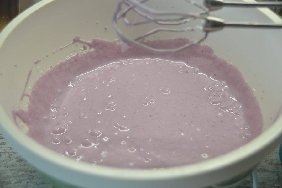 Соедините вместе взбитый маскарпоне, взбитые сливки, влейте желатиновую смесь в черносмородиновом сиропе.