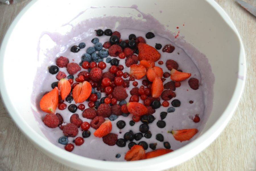 Вмешайте аккуратно свежие ягоды в сливочно-сырную массу.