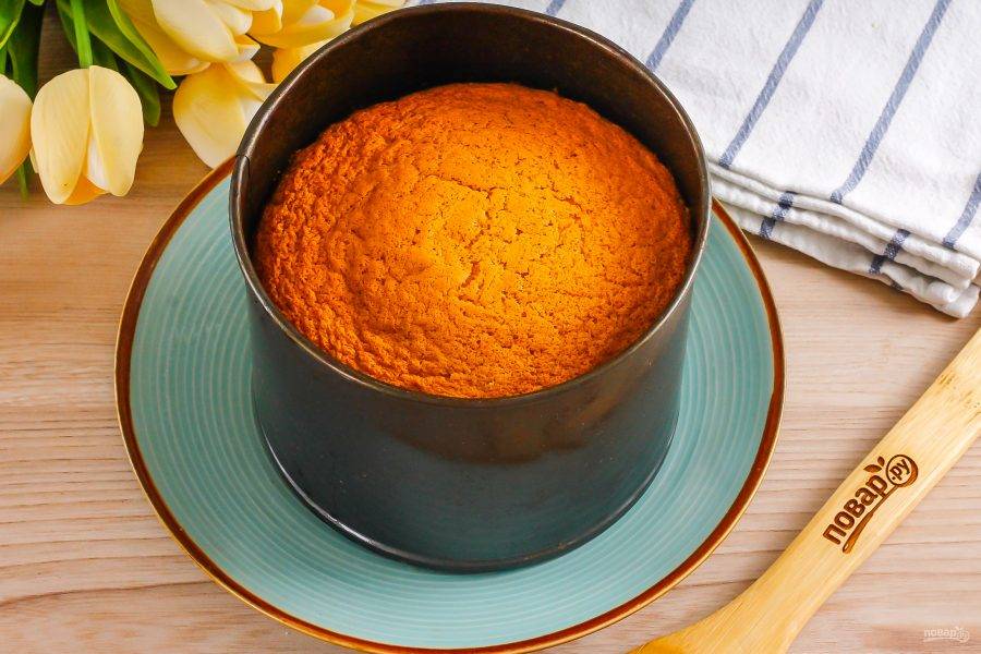 Прогрейте духовку до 180 градусов и испеките в ней бисквит примерно 20-25 минут, проверьте его готовность длинной деревянной шпажкой, она должна выходить из него сухой. Извлеките форму с бисквитом и уложите ее на бок, чтобы он не опал. Остудите.