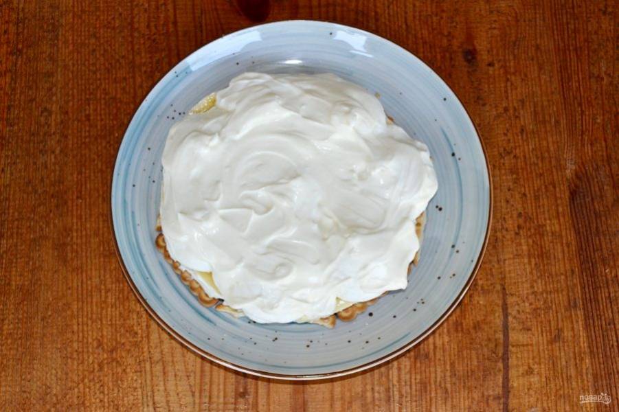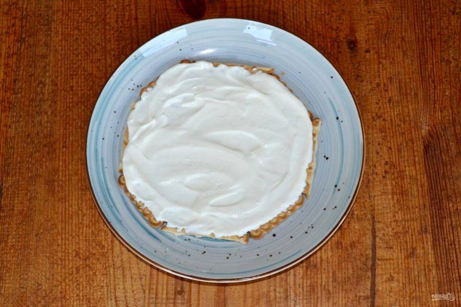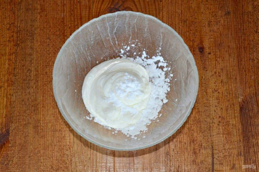 Для начала приготовьте крем. Для этого сметану соедините с сахарной пудрой и взбейте до пышности.