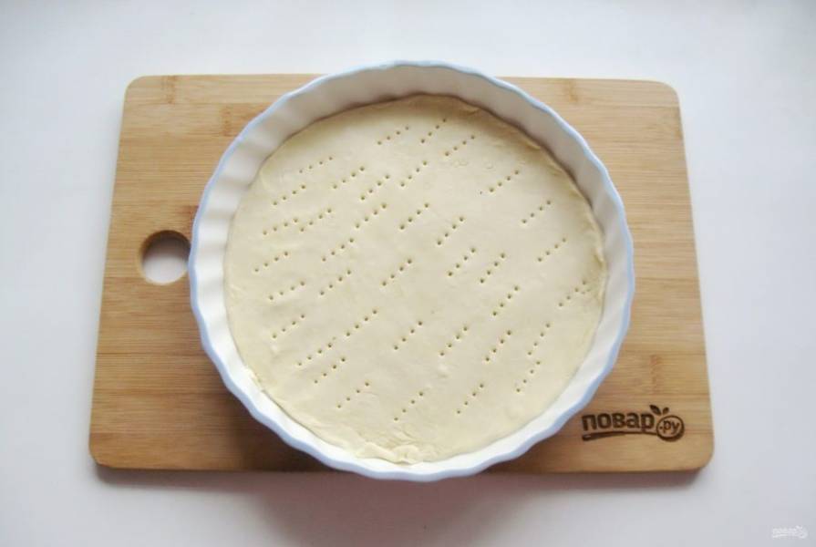 Слоеное тесто раскатайте в пласт и выложите в форму для выпечки.