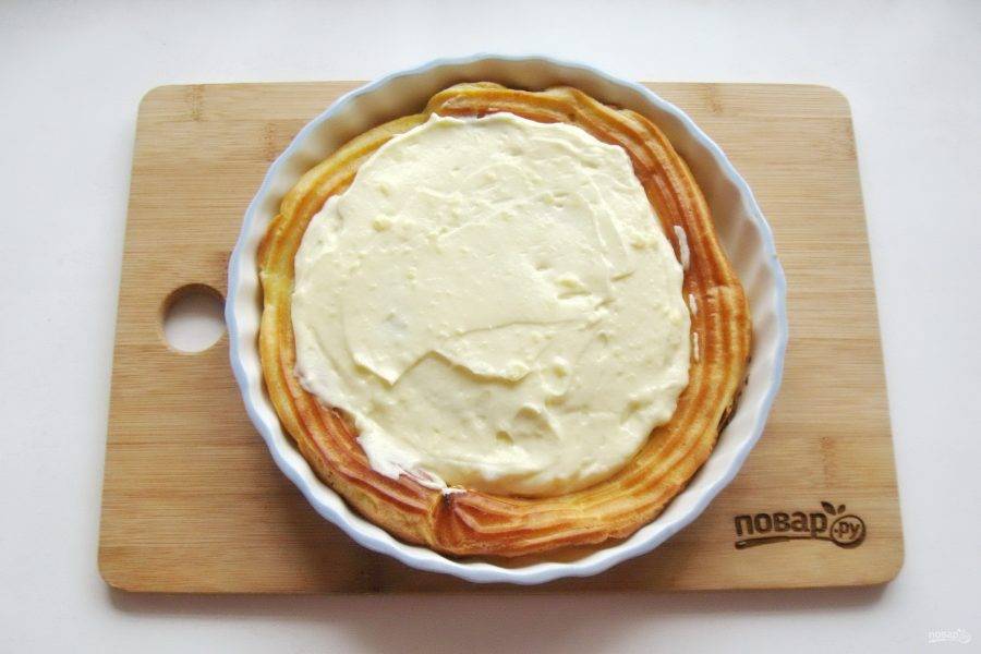 С помощью кулинарного мешка с насадкой отсадите круги из заварного теста на слоеное.