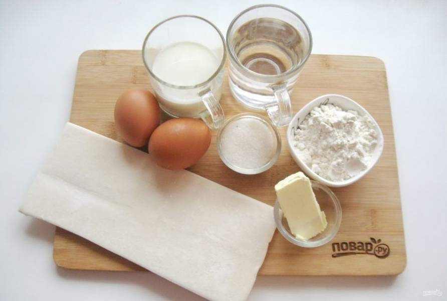 Прежде всего необходимо сделать заварное тесто. В кастрюлю налейте воду, добавьте щепотку соли и выложите сливочное масло. Поставьте кастрюлю на плиту и доведите масло до полного растворения.