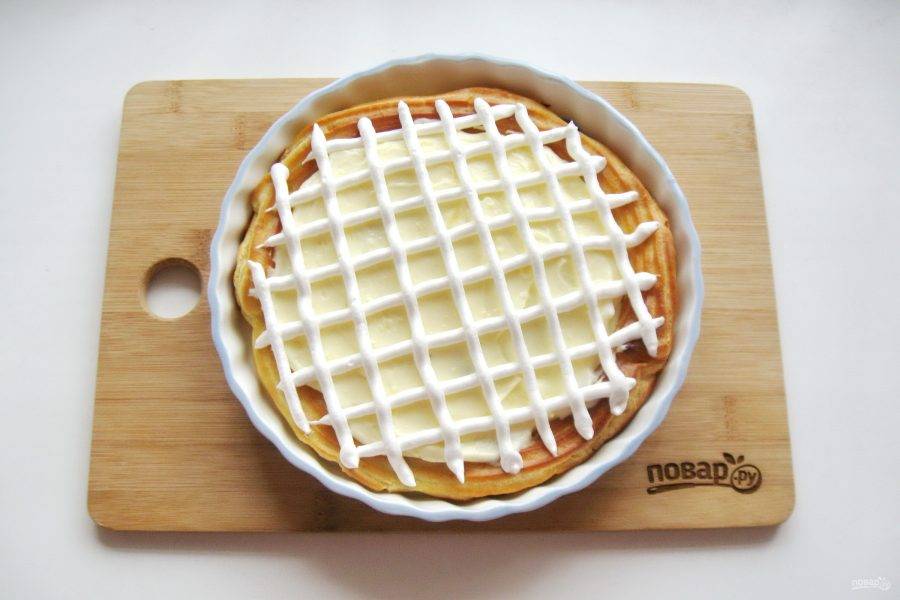 С помощью кулинарного мешка нанесите сеточку из оставшихся белков на крем.