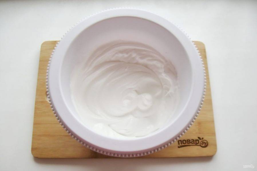Три белка взбейте в устойчивую пену. Затем постепенно всыпьте 150 грамм сахара. Должна получится стойкая, густая и плотная масса, как для безе.