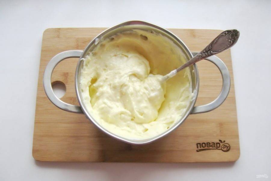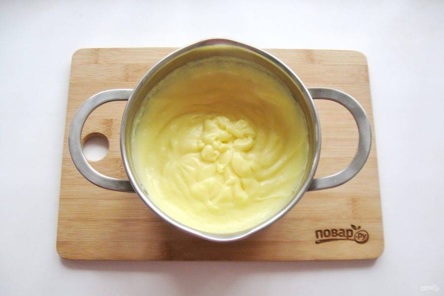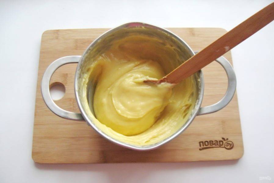 Приготовьте крем для торта. Смешайте 3 яичных желтка с 30 граммами сахара и 3 столовыми ложками крахмала. Молоко налейте в кастрюлю, доведите до кипения и добавьте смесь желтков, сахара и крахмала. Постоянно перемешивая венчиком, доведите крем до загустения. Добавьте ванильный сахар.