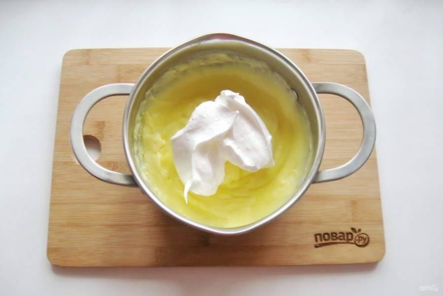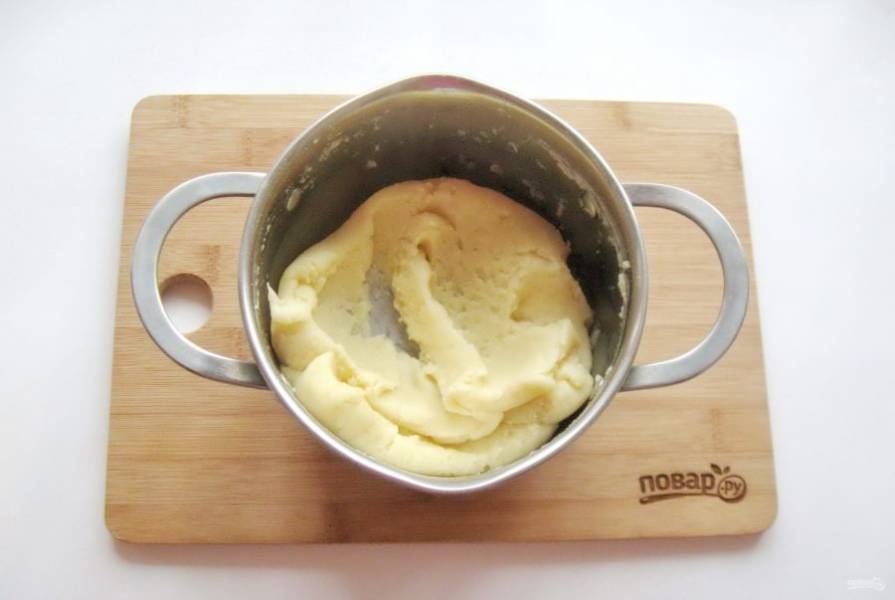 Получившуюся смесь немного охладите и по одному добавьте три яйца.