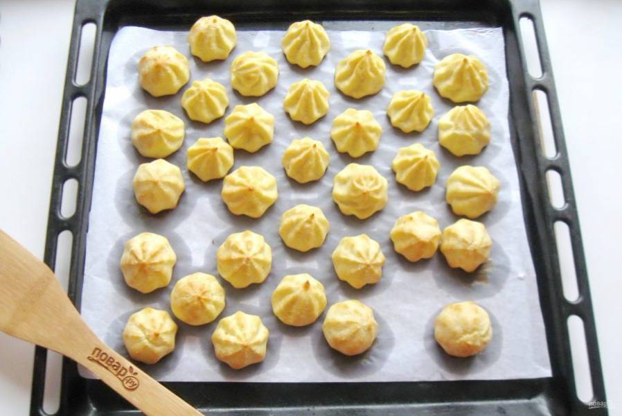 Остальное заварное тесто отсадите также с помощью кулинарного мешка на противень в виде цветочков. Выпекайте в духовке при температуре 200 градусов первые 15 минут. После огонь убавьте до 180 градусов и пеките еще 15-20 минут до готовности.