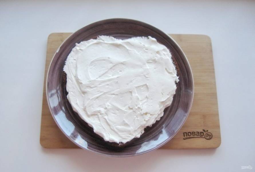 Остывший медовый корж разрежьте на две части вдоль. Обильно смажьте кремом первый корж.