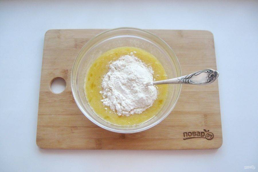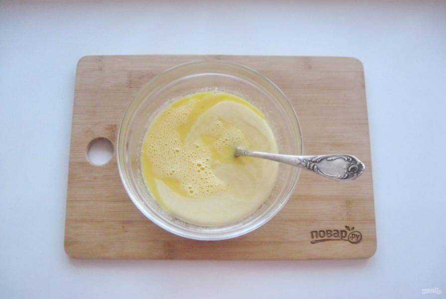 Влейте яйца в охлажденную смесь мёда, сахара, масла и соды.