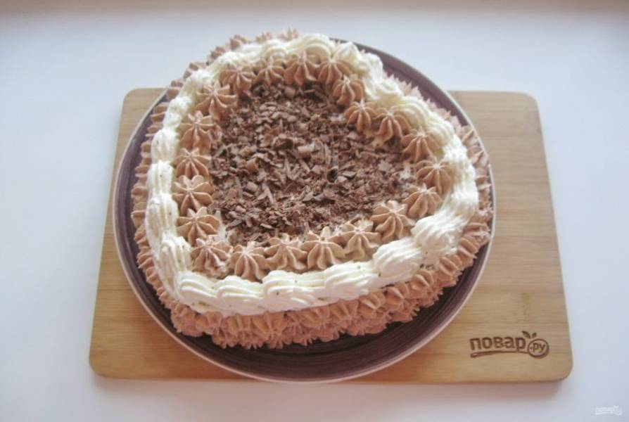 Оставшиеся 200 мл. сливок соедините с какао-порошком и сахарной пудрой. Взбейте коричневый крем. Украсьте этим кремом бока торта и сделайте узор сверху торта. Серединку посыпьте измельченным шоколадом.