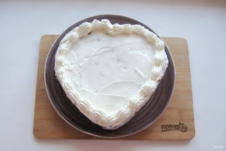 Накройте вторым коржом и смажьте кремом, но менее тонким слоем. С помощью кулинарного мешка с насадкой сделайте узор белым кремом по контуру торта в виде сердца.