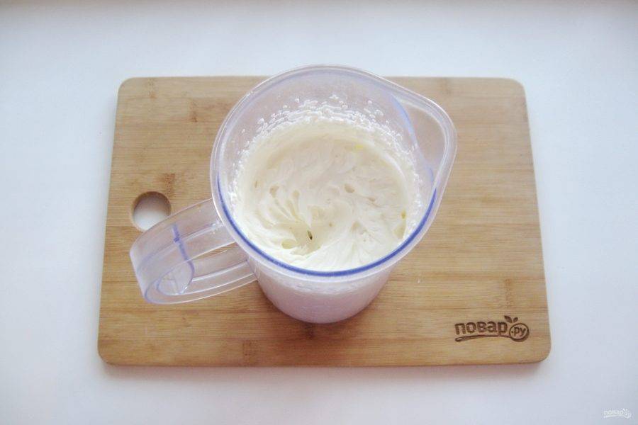 Пока корж остывает, приготовьте крем. Перед взбиванием сливки поставьте на 10 минут в морозильную камеру. 300 мл. сливок взбейте с сахарной пудрой. Количество пудры берите по вкусу.