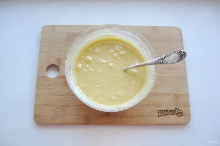 Добавьте соду и перемешайте. Смесь сразу вспенится. Это реакция соды и мёда, охладите.