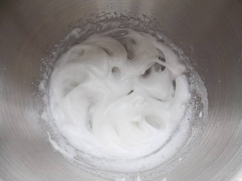 Продолжая взбивать, вливайте сироп с агар-агаром небольшими порциями. Взбивайте до пышного суфле.