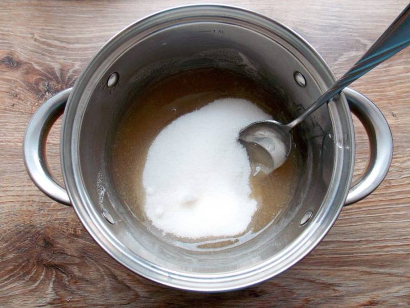 Набухший агар-агар поставьте на средний огонь и доведите до кипения. Всыпьте 300 грамм сахара и перемешайте. Доведите до кипения и варите на среднем огне в течение 4 минут. Если есть кулинарный градусник, то температура кипения должна быть 110-112 градусов. Снимите с огня и дайте немного остыть.