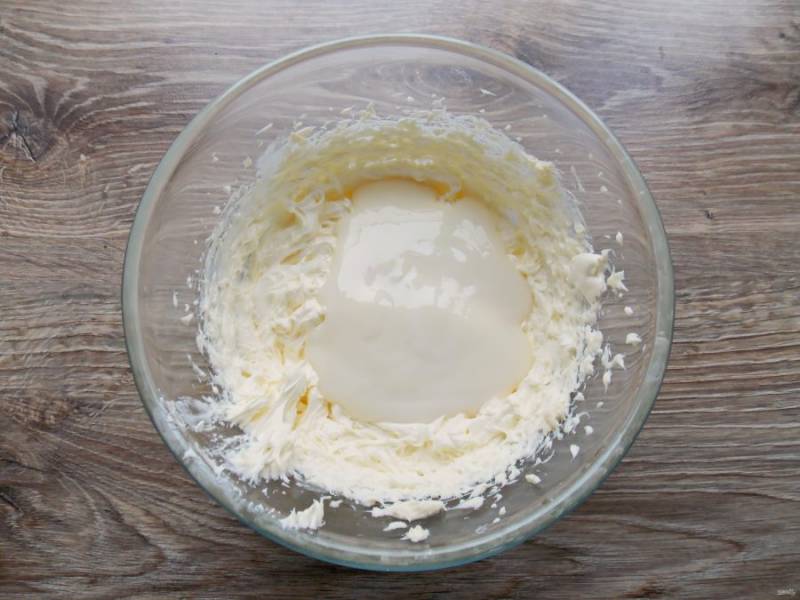 Влейте сгущенное молоко и взбейте в пышную массу.