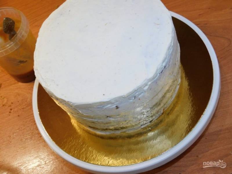 Каждый корж пропитайте апельсиновой карамелью и смажьте кремом.