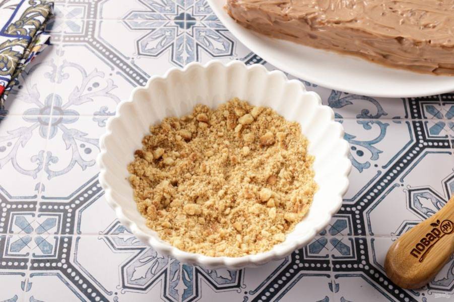 Украсить десерт можно орешками или любым кондитерским декором, я использовала крошки из печенья. Поломайте печенье руками так, чтобы остались небольшие кусочки.