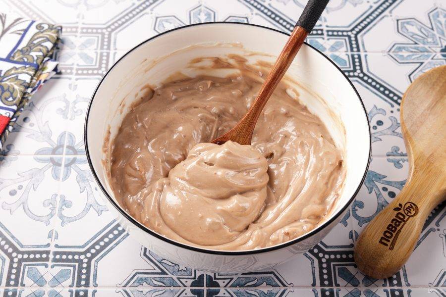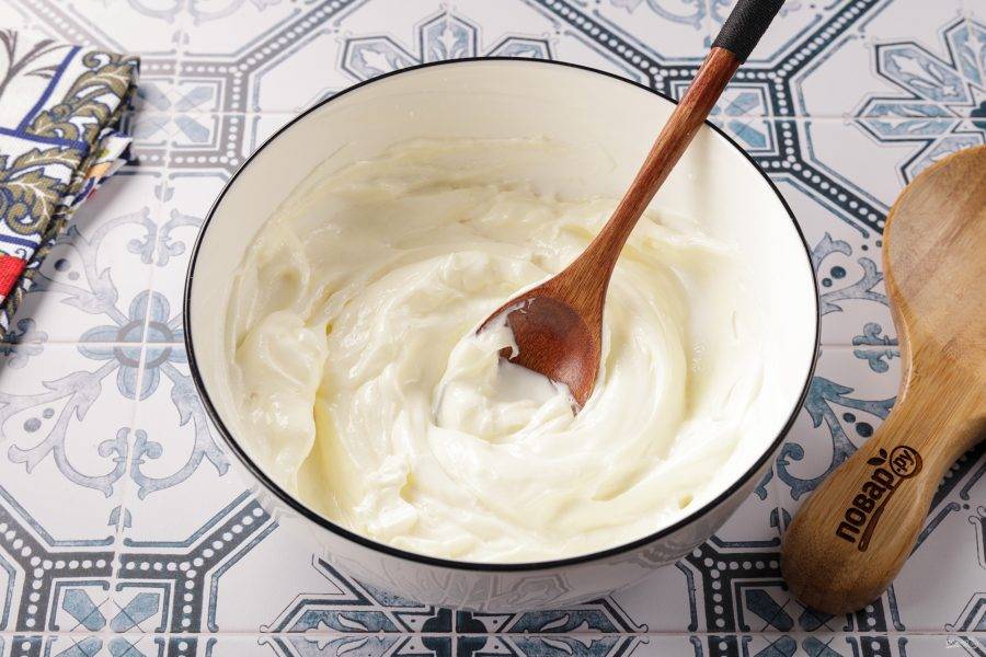 Перемешайте лопаткой или ложкой. Не используйте миксер, чтобы не нагрелась сметана. От тепла она станет более жидкой.