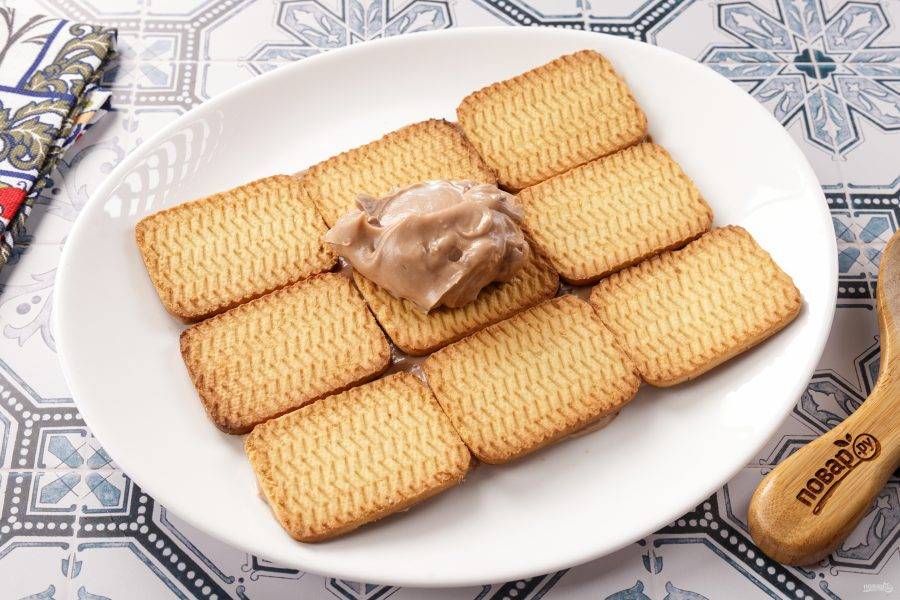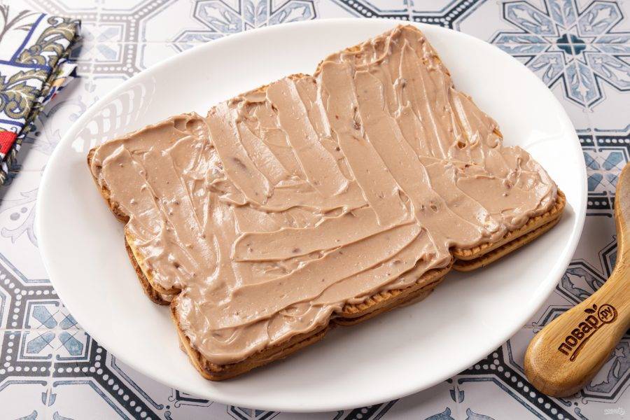 Приготовьте блюдо для подачи торта. Нанесите небольшое количество крема на дно, десерт у нас снизу не получится сухим, а печенье будет хорошо держаться и не скользить.