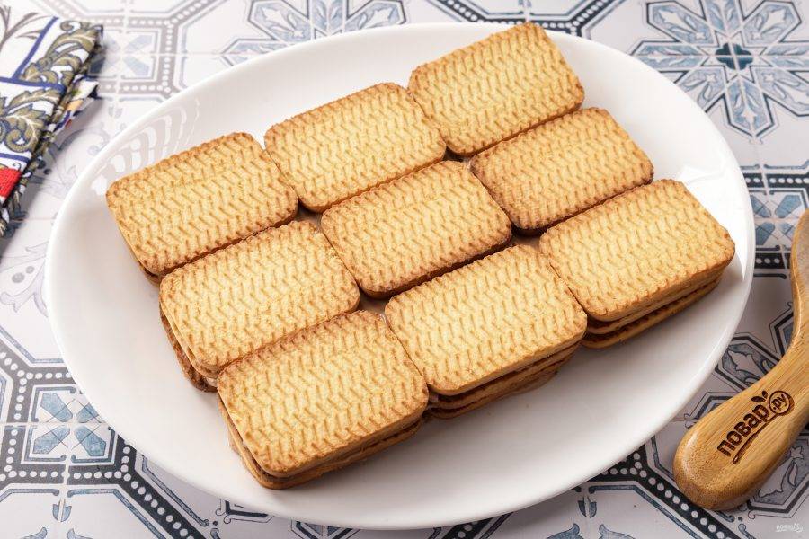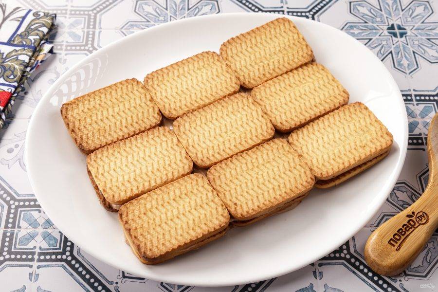 И выложите на крем оставшееся печенье. Возможно у вас получится больше слоёв, всё зависит от размеров тарелки.