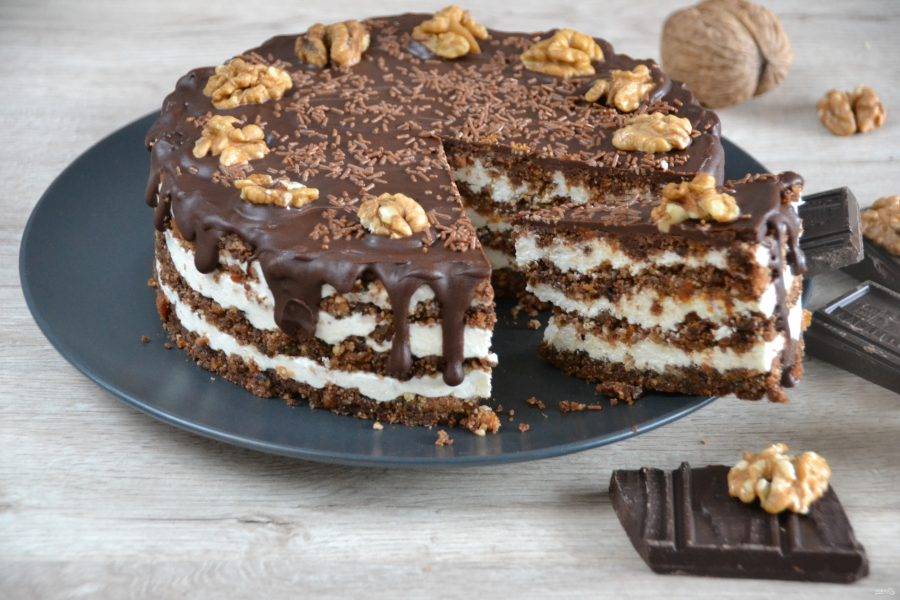 Полейте шоколадной глазурью по краю торта, чтобы образовались шоколадные подтёки, при желании можно полностью залить верх торта шоколадом, украсить ядрами грецких орехов.