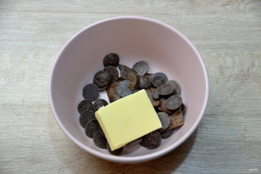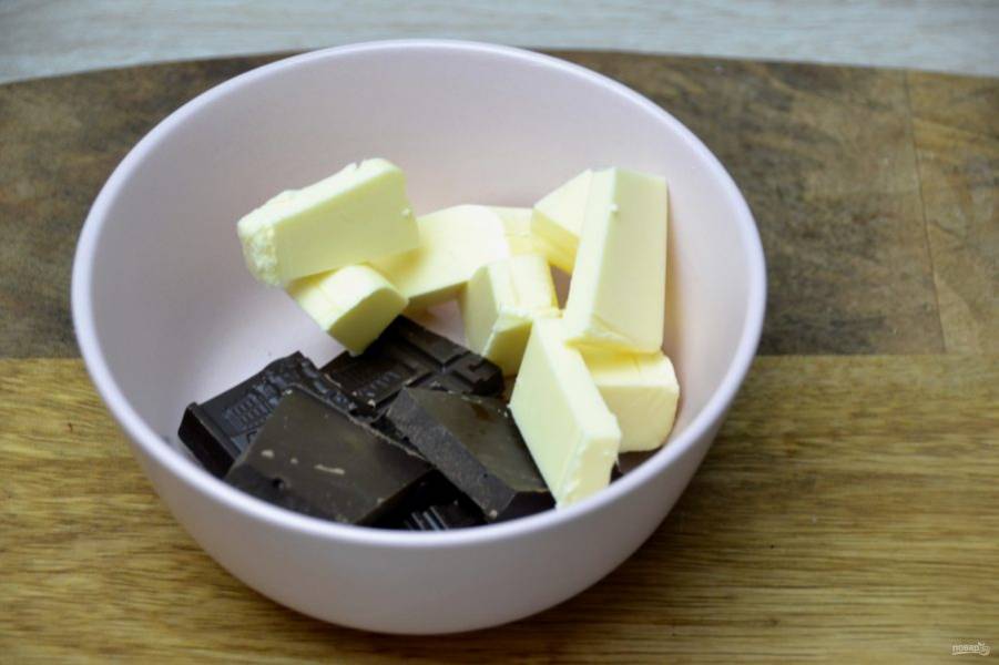 Растопите короткими импульсами по 30 секунд в микроволновой печи 70 грамм шоколада и 70 грамм сливочного масла.