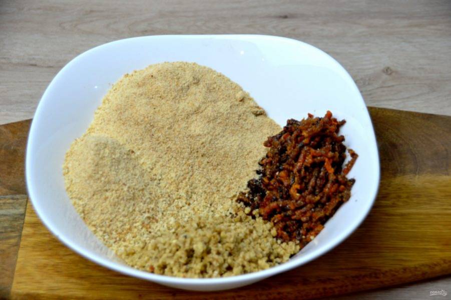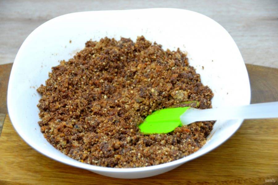 Измельчите через мясорубку или в блендере ванильные сухари, сухофрукты, орехи.