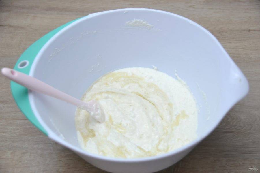 Нагрейте желатин, это можно сделать в микроволновой печи за 10-15 секунд, или любым другим способом. Влейте растопленный желатин в творожно-сметанную массу, смешайте.