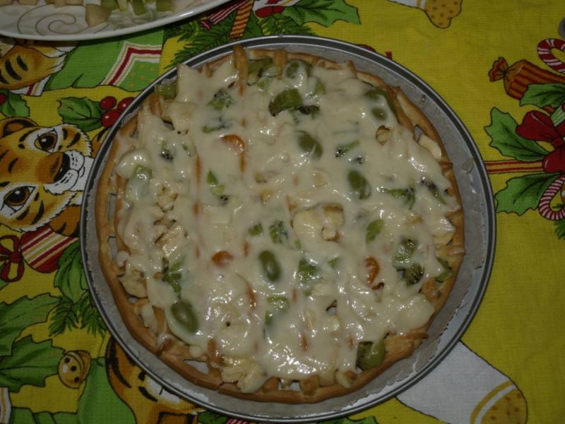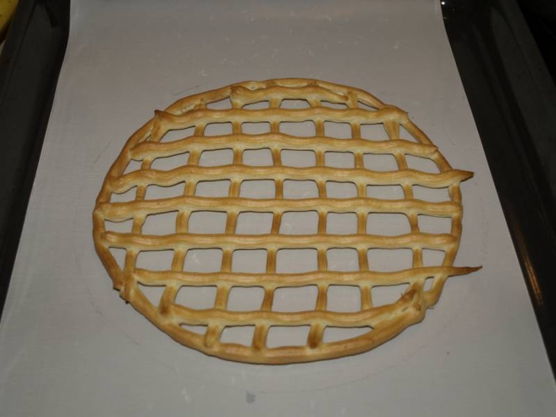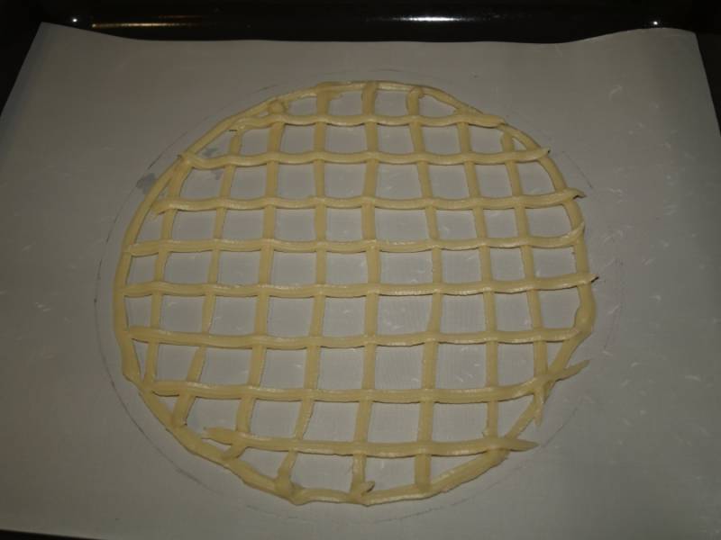На пергаменте начертить круг диаметром 24 см. Тесто переложить в конд.мешок с насадкой 6-8мл. И выдавить на пергамент сначала круг, потом заполнить его квадратиками 3х3см.