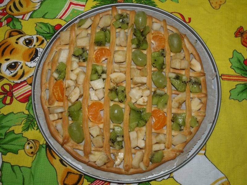 На блюдо положить пергамент, затем первый корж, далее заполняем ячейки фруктами