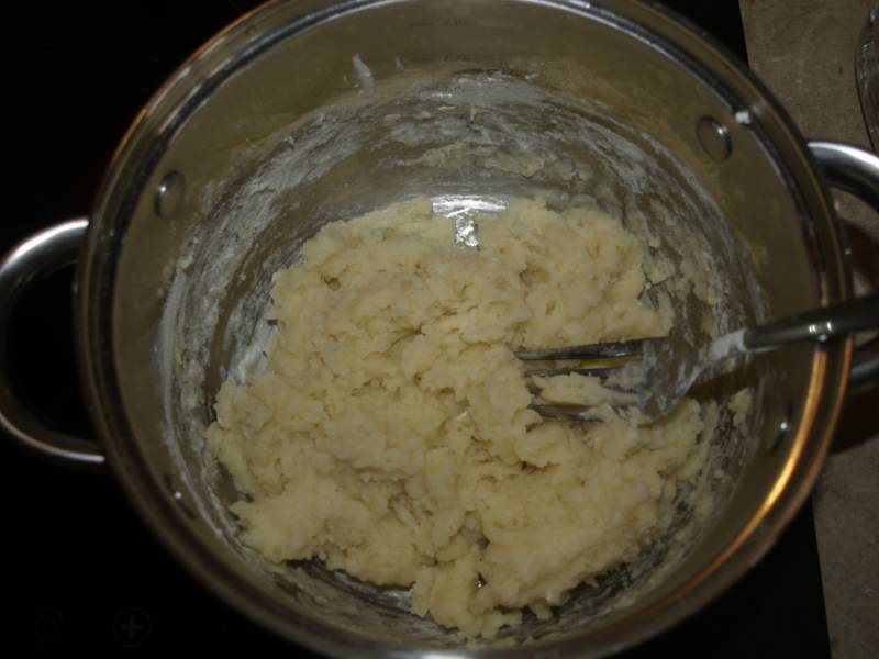 Делаем заварное тесто. В кастрюльке довести до кипения воду,масло и соль,снять с огня, в горячую жидкость всыпать в муку, интенсивно размешать. Кастрюлю вновь поставить на слабый огонь и продолжать помешивать пару минут.