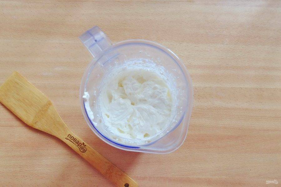 Сливки жирностью 33-35 % соедините с сахарной пудрой и взбейте до плотной, стойкой консистенции. Крем готов.