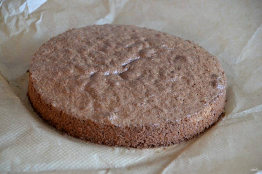 Для сборки торта возьмите кондитерское кольцо диаметром 20 см. Установите на твердую поверхность, вдоль бортиков проложите ацетатную ленту. Выложите ровно по центру первый бисквитный корж. Пропитайте корж пропиткой, приготовленной из 2 чайных ложек сахара, 100 мл. воды и 2 ст. ложек крепкого алкоголя (кирша, рома или коньяка). Точно так же пропитайте и второй корж.