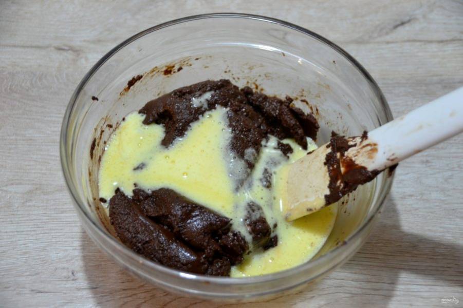 Влейте яичные желтки с сахаром к растопленному и немного остывшему шоколаду, смешайте.