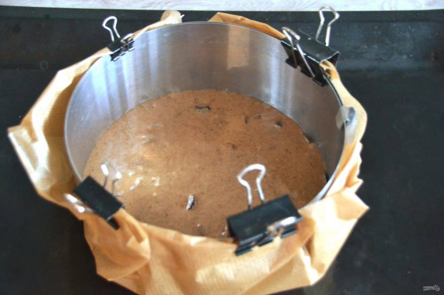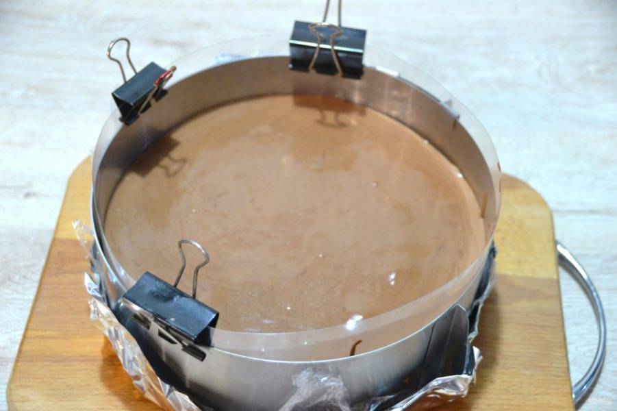 Выложите примерно половину шоколадного мусса в форму для сборки торта.