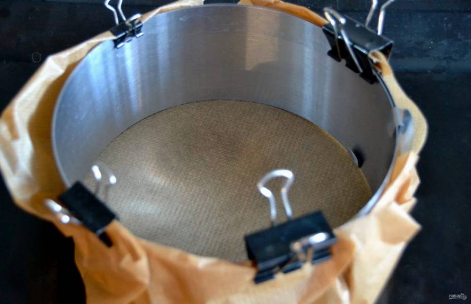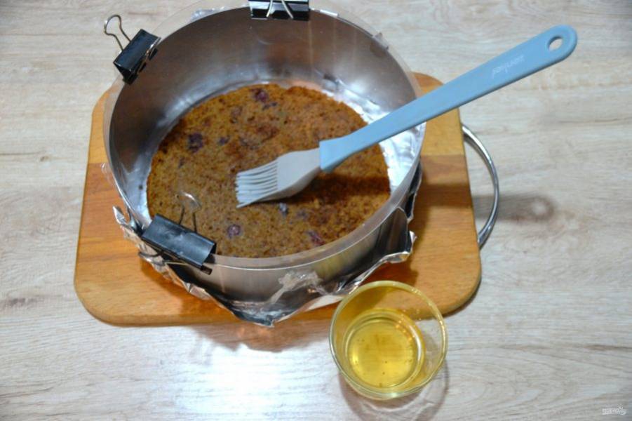 Включите духовку на разогрев до 180 градусов и подготовьте разъемную форму для выпекания диаметром 18 см., установите ее на противень.