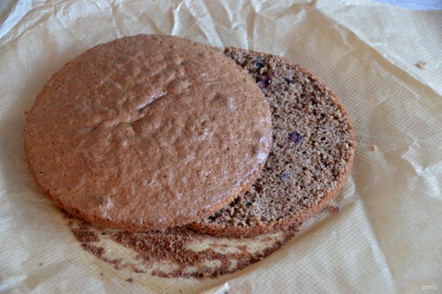 Выложите второй бисквитный корж, на него вишневое компоте.