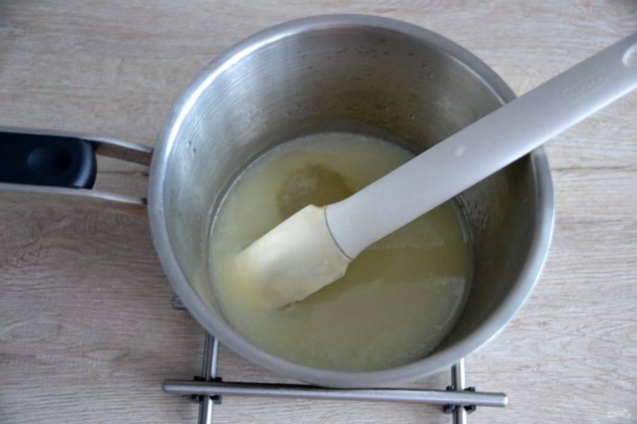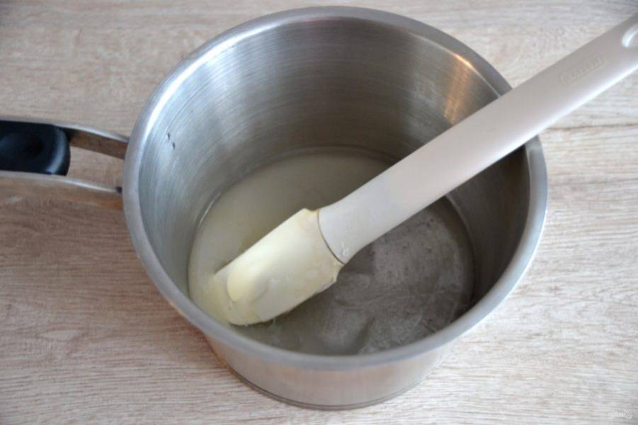 Влейте в сотейник воду, всыпьте сахар, добавьте глюкозный сироп.
