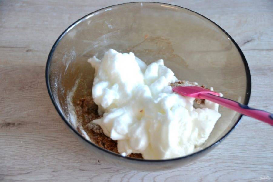 Добавьте в тесто взбитые белки, аккуратно вмешайте их силиконовой лопаткой до однородной консистенции.