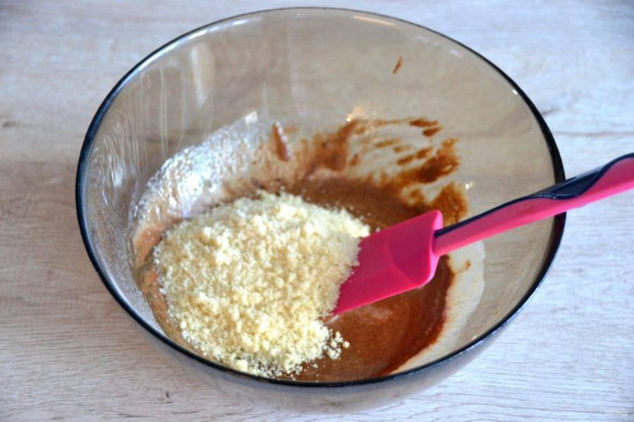 Добавьте к шоколадно-желтковой массе сначала миндальную муку, вмешайте.